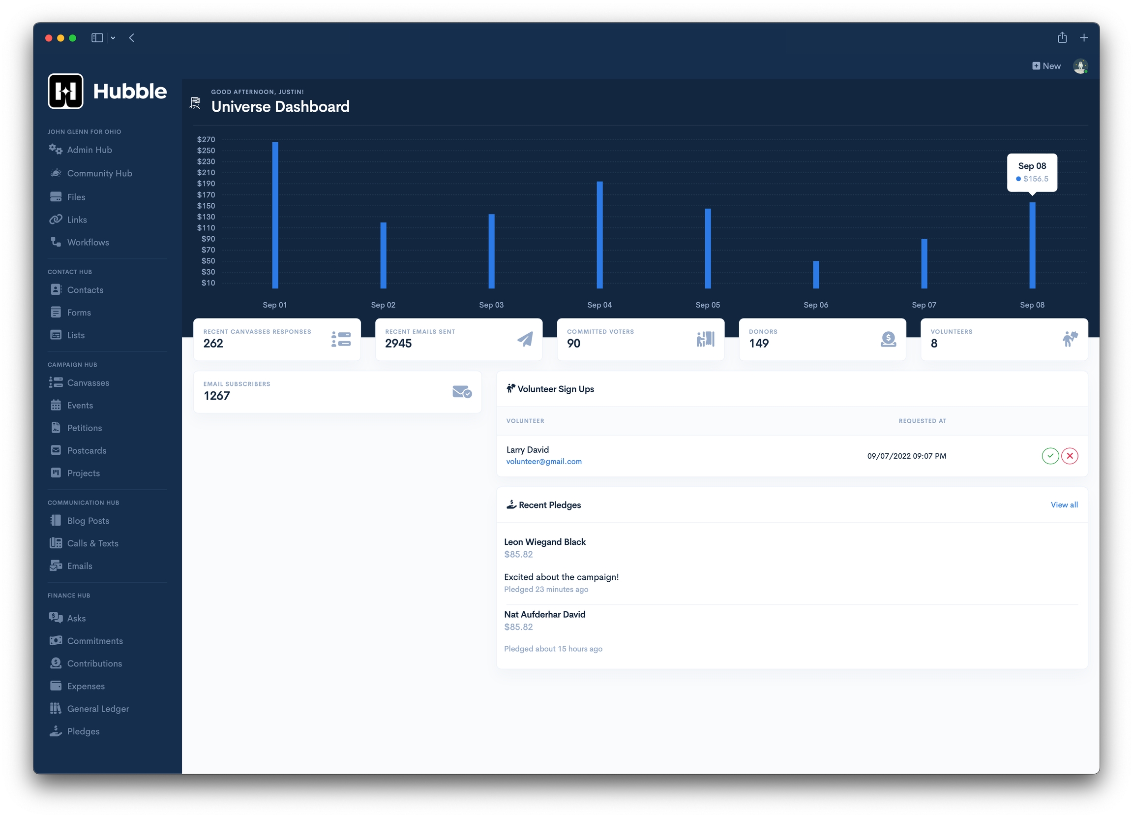 Hubble is the platform to centralize your political campaign. It's got all your voters, donors, and contacts (plus more) all in one place.